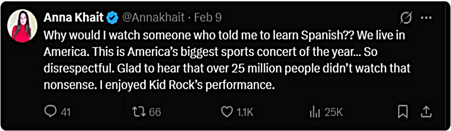 Recognizing that foreign languages spoken in America are a racist hot-button issue for MAGA Republicans, President Trump campaigned in 2024, saying, “We have languages coming into our country. We don’t have one instructor in our entire nation that can speak that language. These are languages; it’s the craziest thing, they have languages that nobody in this country has ever heard of. It’s a very horrible thing”. After being sworn in 2025 as President, he signed a non-binding executive order designating English as America’s official language. There are non-racist American Whites who had no problem with, and even enjoyed, this year’s NFL American Hispanic language-only halftime show, but do experience anxiety over what the ramifications may be with the fact that America’s future largest ethnic group, in a one-person-one-vote majority rule nation, will speak a second non-English language.