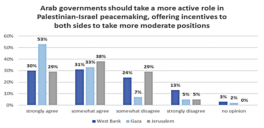 A poll by the Palestine Center for Public Opinion, taken June 27-July 19 shows a dramatic rise in supporting an enhanced role in peacemaking for the Arab states.