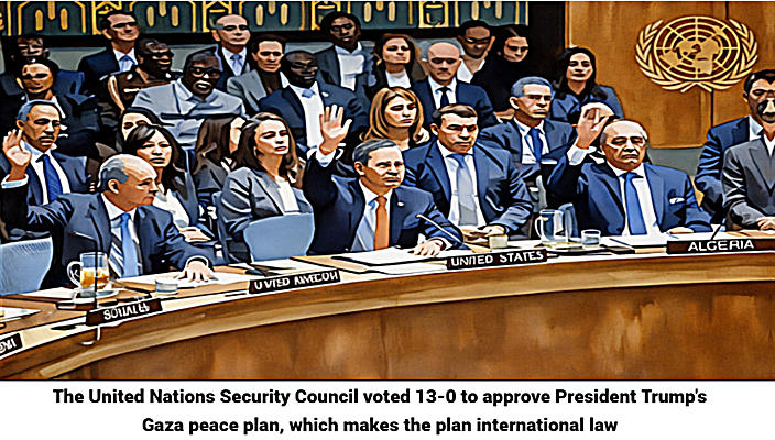 Despite Israeli Prime Minister Netanyahu’s frequently stated goal of denying Palestinians an independent state of Palestine, President Trump’s peace plan lays the groundwork and a path to an independent state of Palestine. It makes Palestinian’s recognized political leadership, the Palestine Liberation Organization (PLO), along with the Muslim states of Saudi Arabia, Jordan, the United Arab Emirates, Indonesia, Pakistan, Turkey, Qatar, and Egypt, a part of the future planning, reconstruction, and governance of Gaza. Point 16 of the peace plan specifically states that Israel will not occupy or annex Gaza. But the most important thing about President Trump’s peace plan is that it was internationally authorized by the United Nations (UN), when its Security Council voted 13-0 for Resolution 2803 (2025).