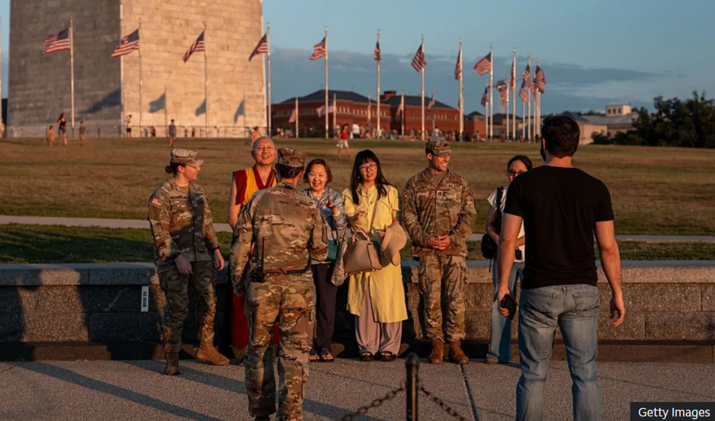 Since there is no real crime emergency in Washington D.C. deployed troops were seen posing for pictures with tourists on the National Mall near the Washington Monument