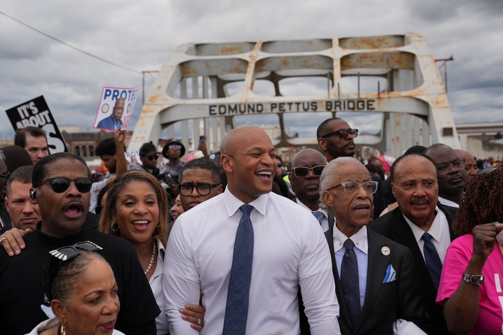 Selma Alabama March 2026 (from left) Isaac Newton Farris Jr. marches with Dawn Moore (wife of Wes Moore), Maryland Governor Wes Moore, Al Sharpton, and Farris’s cousin Martin Luther King III