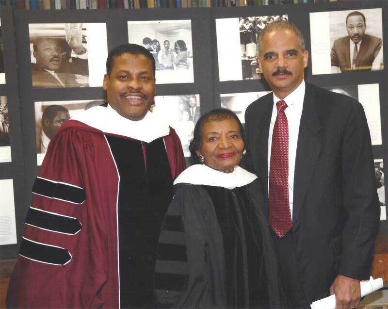 (From left to right) Isaac Newton Farris Jr., Dr. Christine King Farris. U.S. Attorney General Eric Holder at Morehouse College